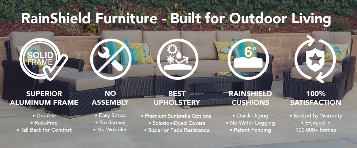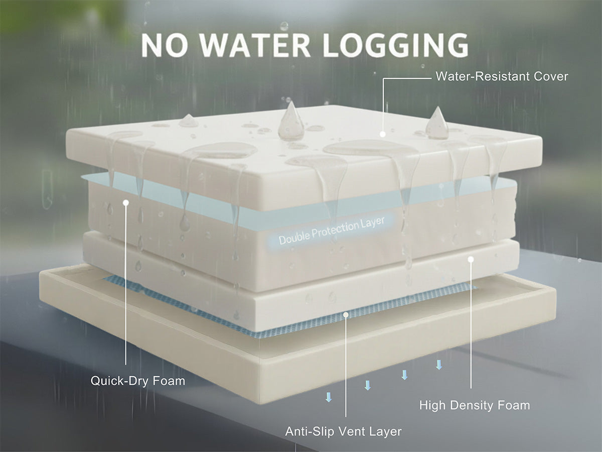 Never worry about wet cushions again with our patent pending 6" cushion technology featuring quick drying foam and triple layer water protection. No water-logging, ever.